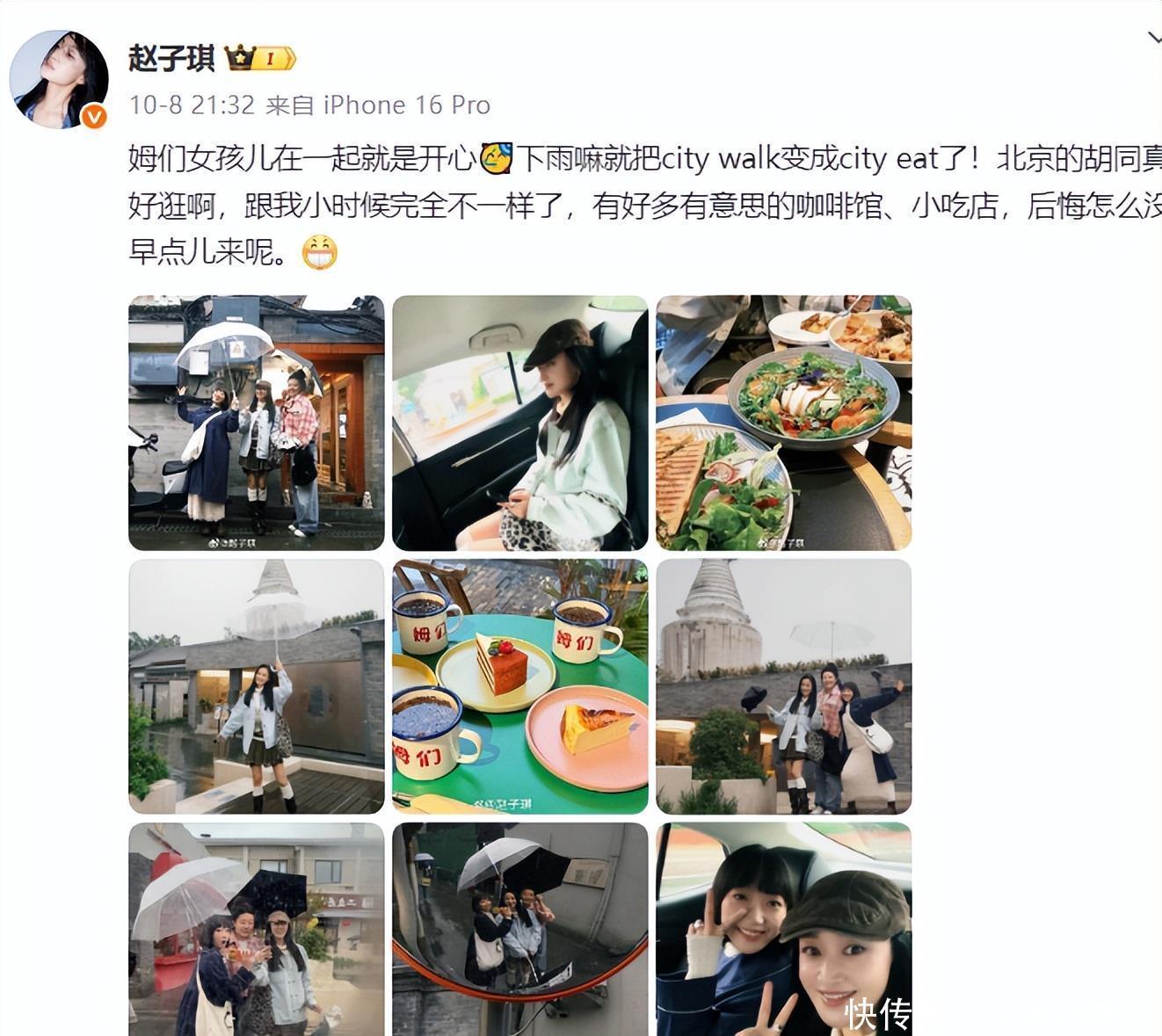 而当年在央视的风光也早已成为了泡影,一步一步走到如今她的经历令人唏嘘。对比当年和她竞争同一个男生的胡可,最终事业爱情双丰收。最新美照如今的赵子琪低调了许多, 除了拍戏其他时间都是跟着家人朋友享受生活。近期她又在社交平台晒了很多日常照片,照片中的她开心的像个小姑娘。和两个好友一同去逛了老北京胡同,下着雨也不妨碍姐妹间的快乐。